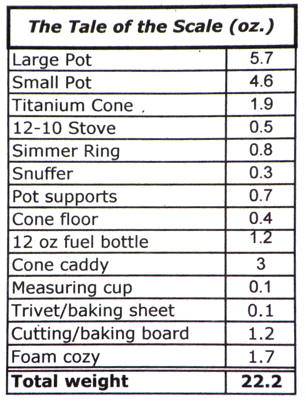 The next season, I moved to Esbit solid fuel tablets and carried only one pot – the smaller pot from my Snow Peak Multi-compact set. I fabricated a split cone from aluminum sheet that fastens with snaps (a la Jon Fong’s Flat Cat, It’s-A-Snap windscreen). The split cone fits inside the pot. The cone is sized so that the pot bottom is at the recommended 1.8’ to 2” above the stove base for burning Esbit tabs. The alcohol bottle, stove, snuffer, simmer ring, measuring cup and one large pot stay home. To get a simmer with Esbit tabs, I use one of Jon Fong’s Titanium Epicurean stoves. This is a ring which controls the amount of air reaching the tablet and thus the burn rate. A double layer folded shield of heavy duty aluminum foil goes under the windscreen and stove to prevent ground scorching.