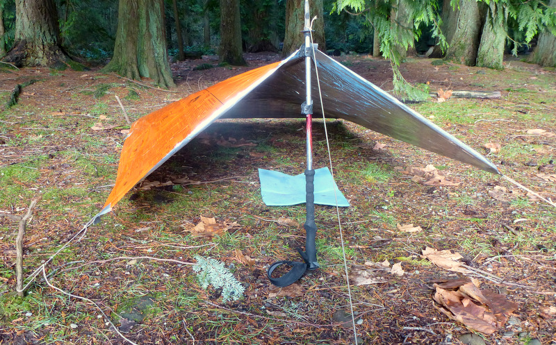 One of my trekking poles serves as the front support and with a little adjustment, I am set up. The blanket tent is pitched with the reflective side down to give me good radiation loss protection. It comes out pretty much as I had imagined.