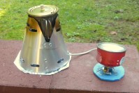 My previous attempts at pan cooking with titanium gear had been frustrated by poor heat distribution – pancakes burnt on the bottom and raw at the edges. The key was making a good heat diffuser plate. My diffuser is made from a scrap of 1/16″ aluminum. I tapped three #6 stainless steel machine screws into it to form a tripod base for pots and pans, held 1/16″ above the plate. The finished plate weighs 1.9 oz. Interestingly I found that Jon Fong offers a similar product. Physics works the same in Washington and Southern California.