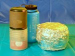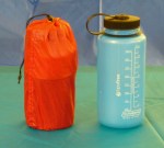 So here is all the stuff I would take to be a chef in the woods. It looks like a lot, but the total weight is still only 39 oz. with a full 4 oz. canister. The stove fits nicely inside the Trail Designs, Ti Caldera Cone windscreen. Cut a slot in the base of the screen for the hose. I bake in a Snow Peak Multi Compact large Ti pot. I bring along a pot cozy made of reflective attic insulation and a GSI mug that becomes the top of the cone caddy, holding the rolled up windscreen. There is also a Fat Daddios, 4″ pan for bread baking and a small stainless steel spatula for turning pancakes. All packed up, it looks like this, with a water bottle shown for scale.