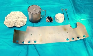 A bottom sheet of folded kitchen aluminum foil completes the combustion space. The Esbit tablet sits in a Trail Designs Gram Cracker holder. Under the holder is a little Ti pan, folded out of Ti scrap from the windscreen stock to contain any Esbit flare ups. Continue reading
