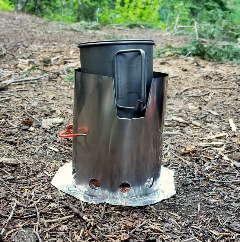 I have been making cone style windscreens, with the top mouth of the cone sized to support the pot rim. They are geometrically a little complicated to design and need to be made in two parts to stow easily inside a small pot. They take a bigger sheet of foil to lay out as well. I liked the simplicity of the Flat Cat windscreens used with my remote canister stoves. But I wanted to see where the tradeoff might be for a simple, ultralight alcohol or Esbit setup vs. a more efficient canister stove. Titanium offers strength, weight savings and resistance to high temperatures. My aluminum windscreens discolor and get banged up with use. While boil times are a bit longer than with cone windscreens, I can use either a 750 ml. Toaks pot or my 600 ml. Snow Peak pot.