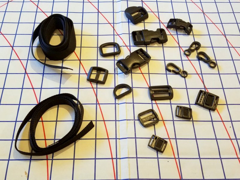 Webbing, buckles, hooks, and similar components come in a wide variety. A really good selection can be found at Strapworks. Take some time to think about the size you need. While 1/2″ and 3/4″ are commonly used widths, 3/8″ will often do for the light loads placed on gear. Polyester webbing, while not as strong as nylon, absorbs less water, doesn’t stretch when wet and drys more quickly. Many choices exist for buckles. Look at other gear to get a better idea of what types might work best. Again order a few extras to build your stock.