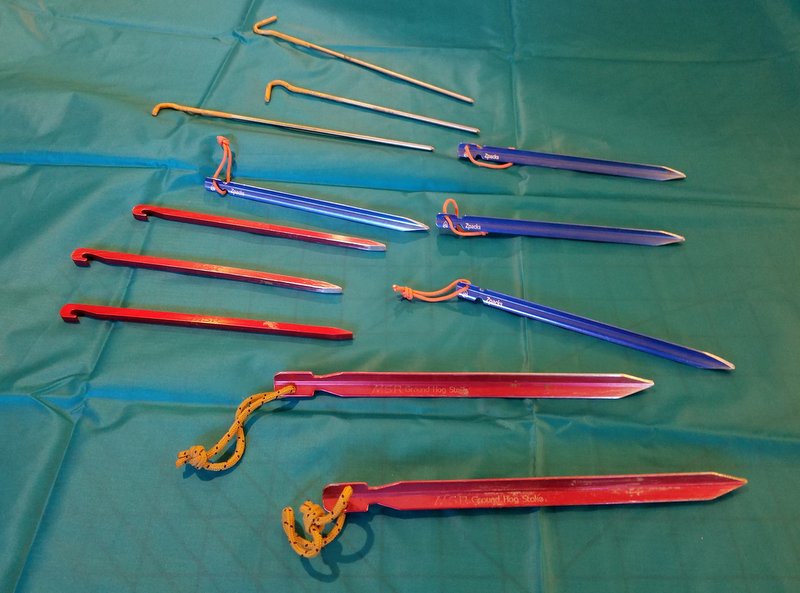 I use a variety of tent stakes. Titanium shepherds crook pegs, while light, don’t have a lot of holding power and are hard to drive into rocky ground. My MSR stakes are Y section Ground Hogs for major guy lines, and a plain, aluminum needle peg, that is no longer made, for edge loops. Z-Packs 6″ Sonic stake has proved to be a good substitute for the old MSR pegs. It is an aluminum Y section stake, pretty light, with a cord loop for extraction. Gradually I also have added some Ti stakes where I really want light weight and will deal with lower holding power. I paint the tops of the Ti stakes a bright color so that they don’t disappear when dropped on the ground.