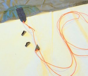 Completing a tent or tarp project requires a lot of other stuff. 3/8″ polyester, single layer webbing works for guy line and stake tie-outs. I have been using light Spectra tent line for quite a while. While it is a little stiff, it does take knots for attachment to tie-outs. My current choice is Z-Packs 1.2 mm. reflective cord. I usually try to get orange for better visibility. The reflective finish also helps prevent tripping over lines in the dark. While I learned how to tie a tautline hitch as a Boy Scout, the knot doesn’t work well with lines this stiff, so my favorite line tensioning device is a Micro Lineloc, also available from Z-packs. Paired with 1.2 mm. line, it provides a light, easy, reliable means of setting up guy lines.