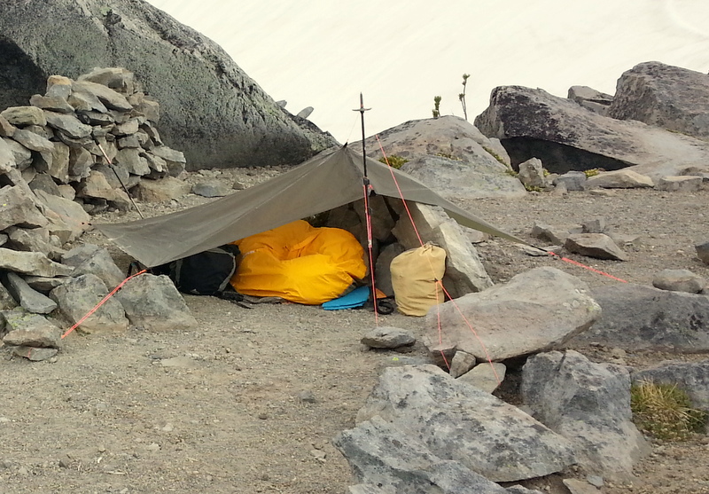 The next outing involved two nights at a high camp at 7500′. I decided to go lighter taking only an old sil-nylon tarp I made a few years ago and my very old Early Winters Gore-Tex bivy bag, to which I had recently added a waterproof zipper. It worked, but the tarp had been designed only as a cooking shelter and was really not long enough to fully cover the bivy bag. In practice this should not be an issue to have a waterproof bag sticking out into the rain, but…. In thinking about it, I wondered if I could easily improve things. A few hours of sewing and an ounce of fabric later, problem solved.
